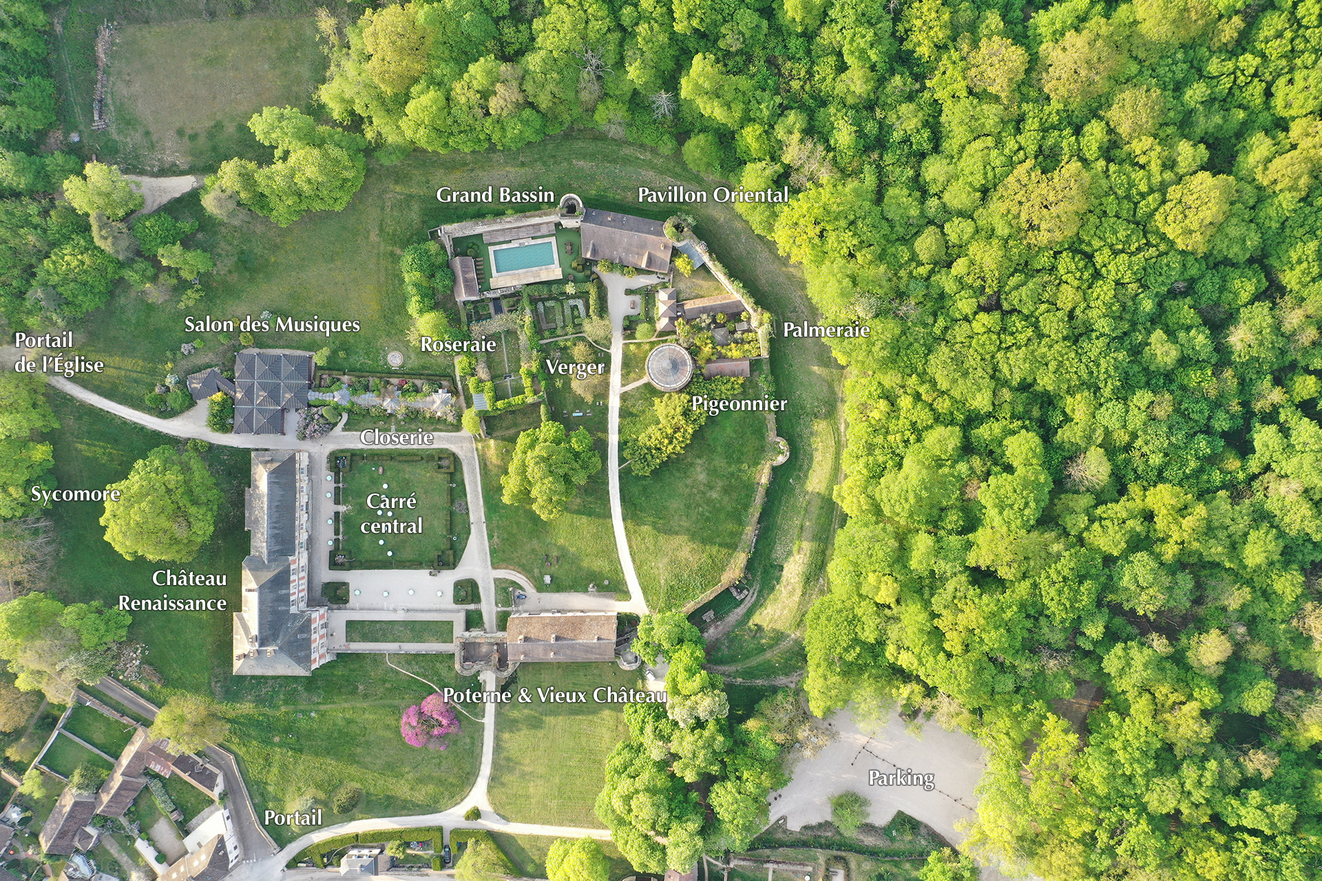 Cette vue aérienne reflète ici la véritable explosion végétale du printemps. Il faut reconnaître que le parc rivalise de couleurs. Comme offertes au ciel de Bourgogne, les bosquets fleuris cernent de nouveau le domaine. Ainsi, remparts médiévaux et douves semblent tenir à distance cette orée de forêt luxuriante.